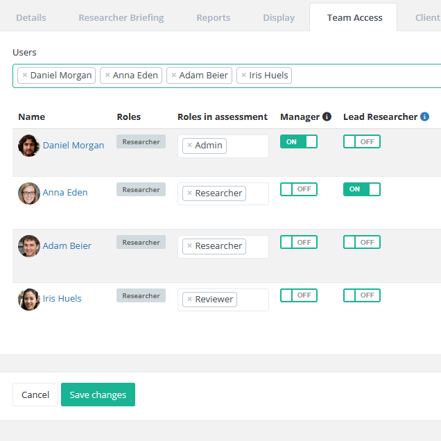 Add team members or clients to assessments and assign roles with fine-grained permissions. Control who can view, edit, review, or publish content so each user has the right level of access throughout the assessment.
