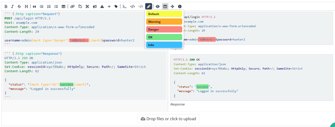 Syntax-highlighted code blocks now also support [mark] tag highlighting! Previously, [mark] highlighting only worked in plain code blocks without syntax highlighting. With this update, you can now combine the two, making it easy to call out specific parts of code, HTTP requests and responses, data snippets, and more, without sacrificing readability.