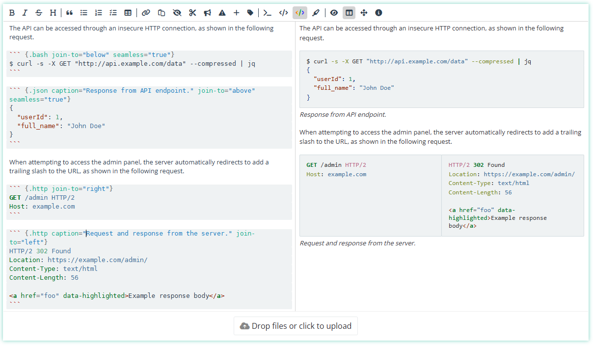 Vertically joined code blocks allow snippets with different syntax highlighting styles to be combined. This is useful when a single example contains multiple languages.